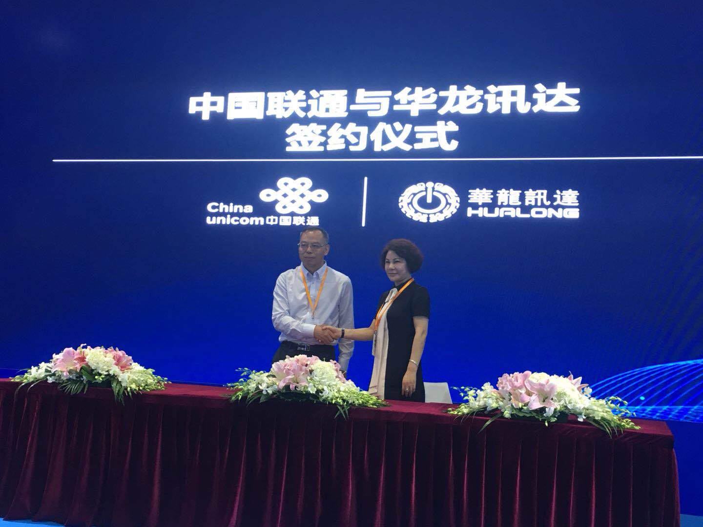 第二轮是华龙讯达与深圳联通战略签约仪式。中国联通网研院副总工顾荣生与华龙讯达董事长胡丽华亲切握手,共同签署合作协议书并留影纪念。最后在激昂的颁奖音乐中,科技自动化联盟理事长梁力强授予华龙讯达2018年度科技自动化科技突破及应用领先产品奖牌,华龙讯达总经理龙小昂上台接过奖牌,与之亲切握手并留影纪念,表示感谢。