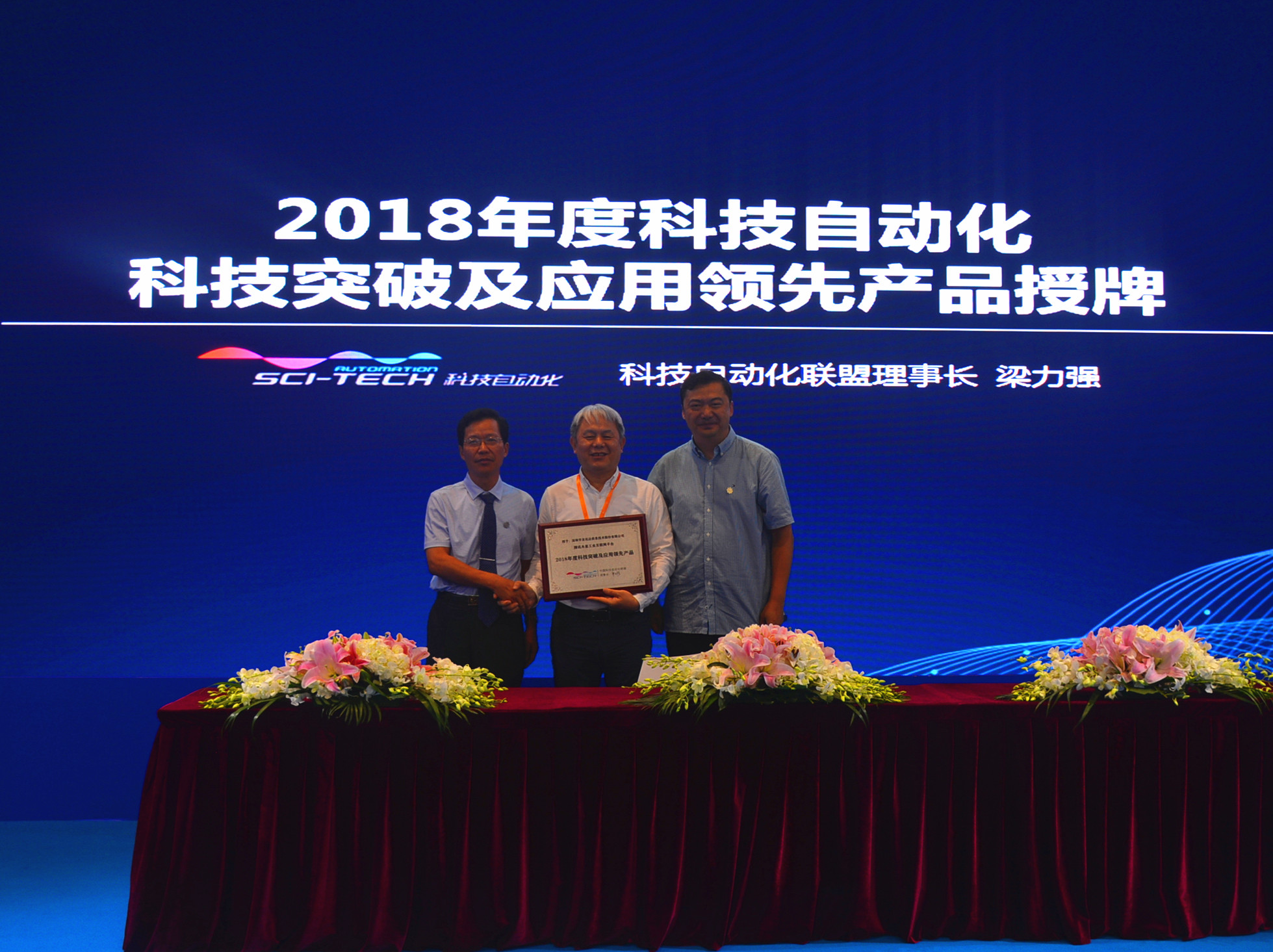 最后在激昂的颁奖音乐中,科技自动化联盟理事长梁力强授予华龙讯达2018年度科技自动化科技突破及应用领先产品奖牌,华龙讯达总经理龙小昂上台接过奖牌,与之亲切握手并留影纪念,表示感谢。
