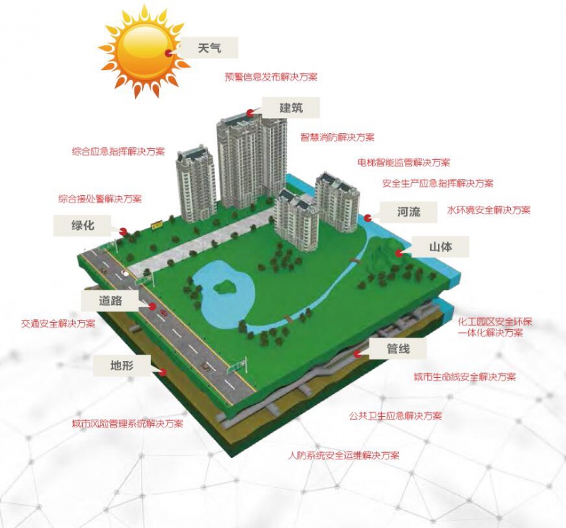 一网一图:包括城市安全运行监测物联网和城市安全一张网,利用物联网、大数据、移动互联网等现代信息化技术,结合城市安全运行体征指标体系和安全分析模型,服务城市安全运行监测。