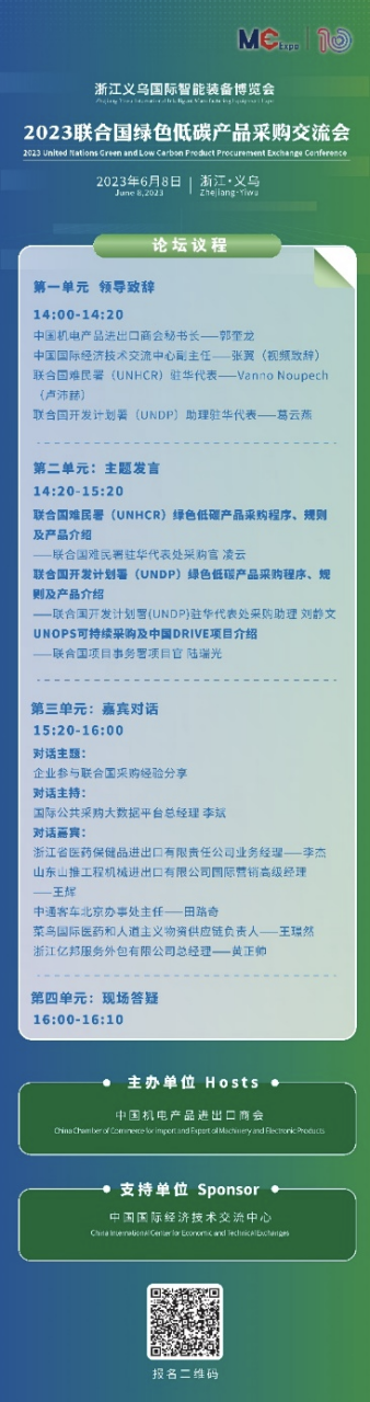 “2023联合国绿色低碳产品采购交流会”特邀联合国难民署(UNHCR)、联合国开发计划署(UNDP)、联合国项目事务署(UNOPS)等机构代表、采购官员现场解析联合国各机构采购程序、规则及采购产品,提出中国企业参与联合国采购的机遇和建议,分享企业参与联合国采购的经验,并将发布2023年采购计划。同期还将主办联合国采购对接会,并在“2023浙江义乌国际智能装备博览会”特设联合国采购产品展示专区,展示中国企业参与联合国采购的相关产品。